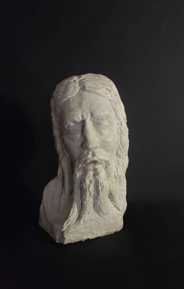 Realizzata in argilla, la scultura esprime la tensione tra fragilità umana e forza spirituale. Le linee scabre e il modellato essenziale trasmettono il peso del dolore, mentre lo sguardo socchiuso e la barba fluente evocano quiete e contemplazione.