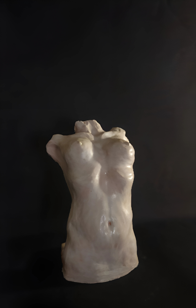 La scelta di interrompere la figura, riducendola all’essenzialità del torso, trasforma l’opera in un simbolo: il corpo non è solo rappresentazione fisica, ma espressione di energia e presenza. Le superfici, modellate con intensità, restituiscono vibrazioni di luce e ombra che animano la scultura.
